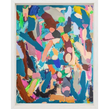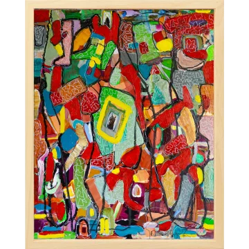 Acrylic paint and gouache on preprocessed hardwood panel in wooden frame.