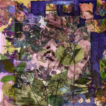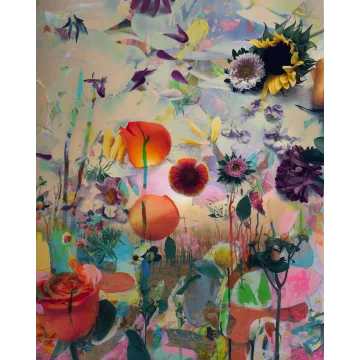 Acrylic and oil paint and pastels on preprocessed 3D canvas in wooden frame.