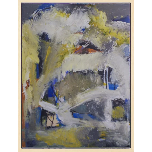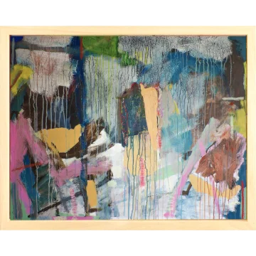 Acrylic paint and gouache on preprocessed hardwood panel in wooden frame.