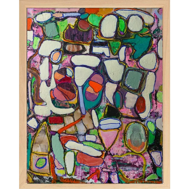 Acrylic and oil paint on preprocessed canvas in wooden frame.