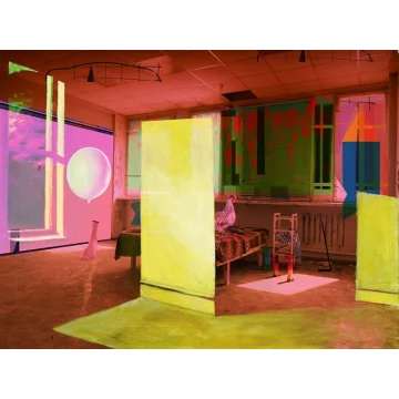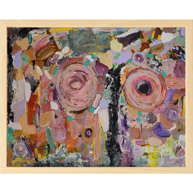 Acrylic and oil paint and pastels on preprocessed wooden panel in wooden frame.