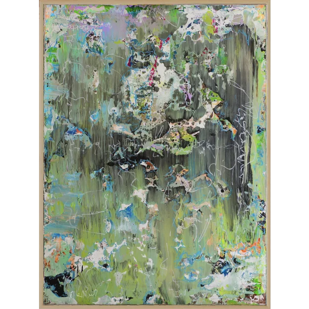 Acrylic paint, oil paint and gouache on preprocessed panel in wooden frame.
