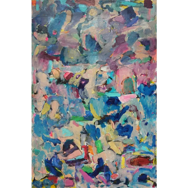 Acrylic and oil paint on preprocessed canvas in wooden frame.