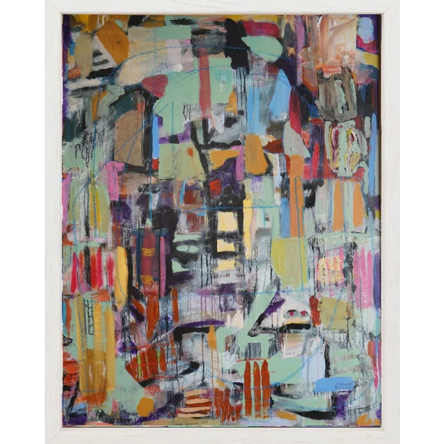 Acrylic paint and gouache on preprocessed hardwood panel in wooden frame.