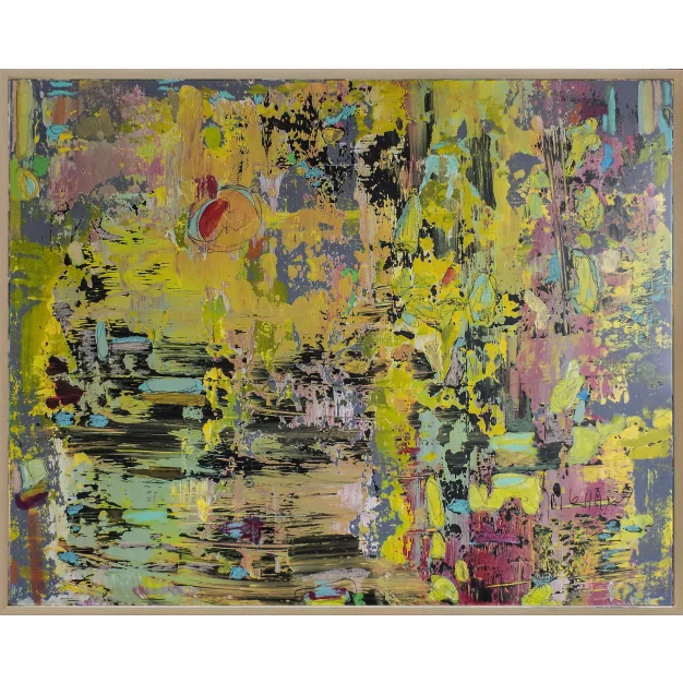 Acrylic and oil paint on preprocessed wooden panel in wooden frame.